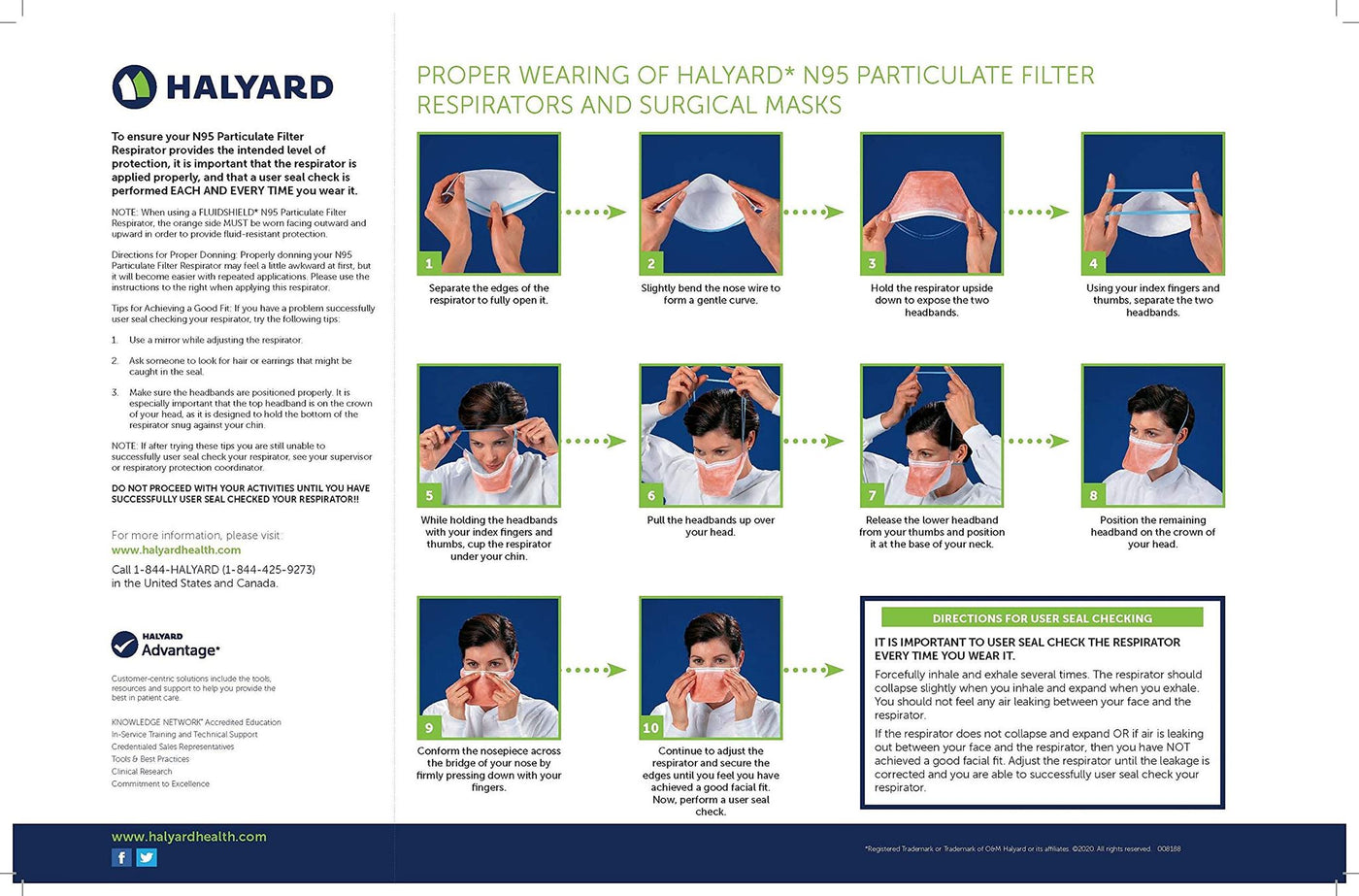HALYARD FLUIDSHIELD N95 Filter Respirators are NIOSH-approved and are designed to provide an effective facial fit as required for proper respiratory protection. Comes with a large breathing chamber and comfortable elastic straps that are securely bonded (not stapled) to the mask for added comfort.
