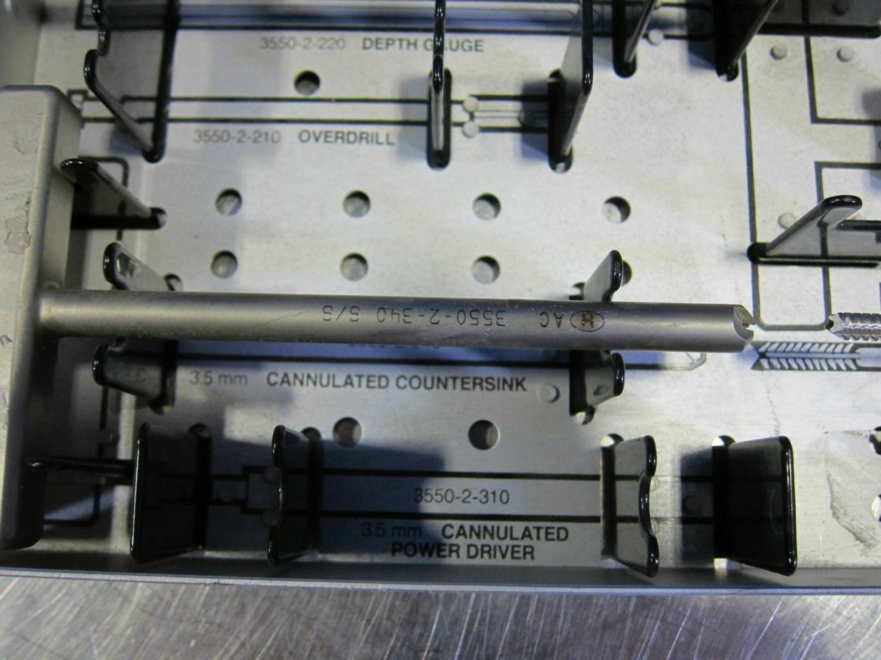 Missing: Guide Pin- MN#: 3550-2-230, Gray Bone Drill- MN#: 5800-6-078, Overdrill- MN#: 3550-2-210, Cannulated Power Driver- Mn#: 3550-2-310, Cortical Tap- MN#: 3550-2-320